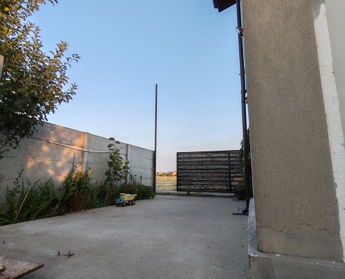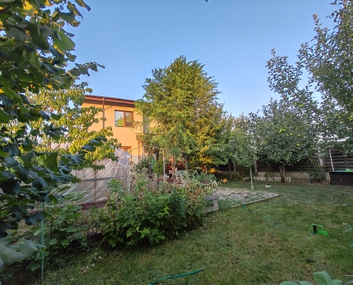 Curte generoasă, cu vegetație bogată pentru un plus de răcoare și aer curat. Pomi fructiferi pe rod: 5 meri, 1 cireș amar, 1 cireș boambe de Cotnari, 1 vișin productiva de Debretin, 1 cais Bergeron, 2 smochini – Ficus carica Col de Dame Gris și Ficus carica Blanche (necesită protecție la vântul rece de iarnă), zmeură, mur, alun pe producție, 2 pruni, magnolie, viță de vie, liliac, hibiscus, ulm de Turmekistan pentru umbră, o mică seră de legume și o mică grădină. Acest spațiu poate fi reamenajat după gustul dumneavoastră.